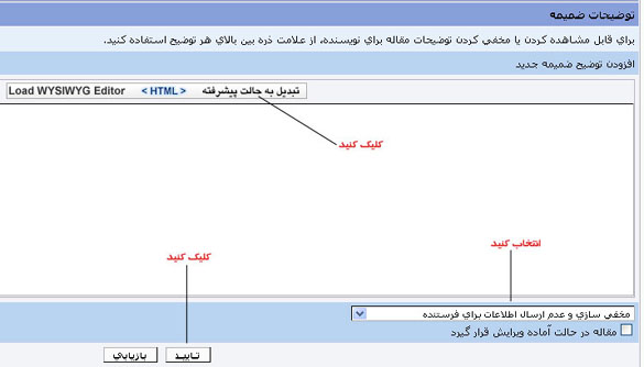 - اگر میخواهید توضیحی را برای فرستندگان همهی مقالات بفرستید یا تغییری را در همهی مقالات انجام دهید، باید به به بخش "مدیریت مقالات< تغییرات جمعی و اطلاع رسانی" بروید. این بخش بیشتر در همایشها کاربرد دارد.