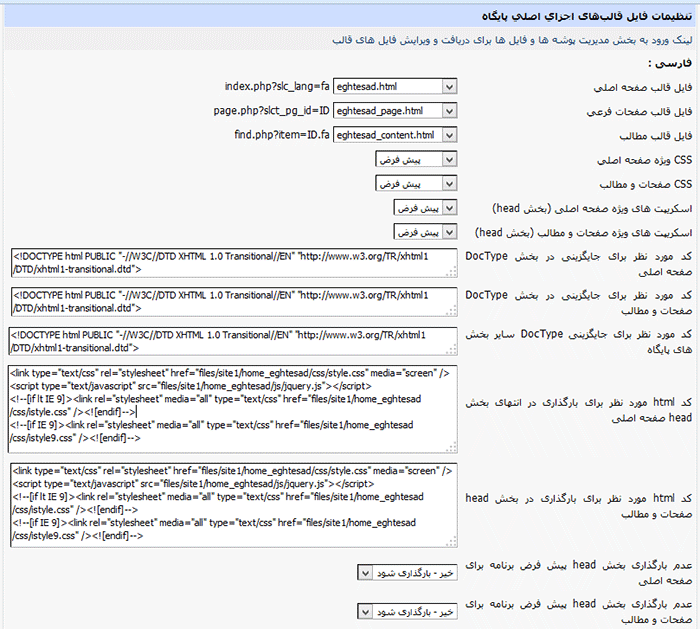 هر نوع فایل css یا js اضافی را هم می توانید با اضافه کردن کدهای مورد نظر در کادرهای موجود در این بخش (بخصوص کادری که محتوای آن در بخش head بارگذاری می شود) در قالب سفارشی خود فراخوانی کنید. مثلا یک پوشه در site1 بسازید و کلیه css ها و js ها را در آن قرار دهید و سپس در این کادر این نشانی ها را به صورت زیر وارد کنید: