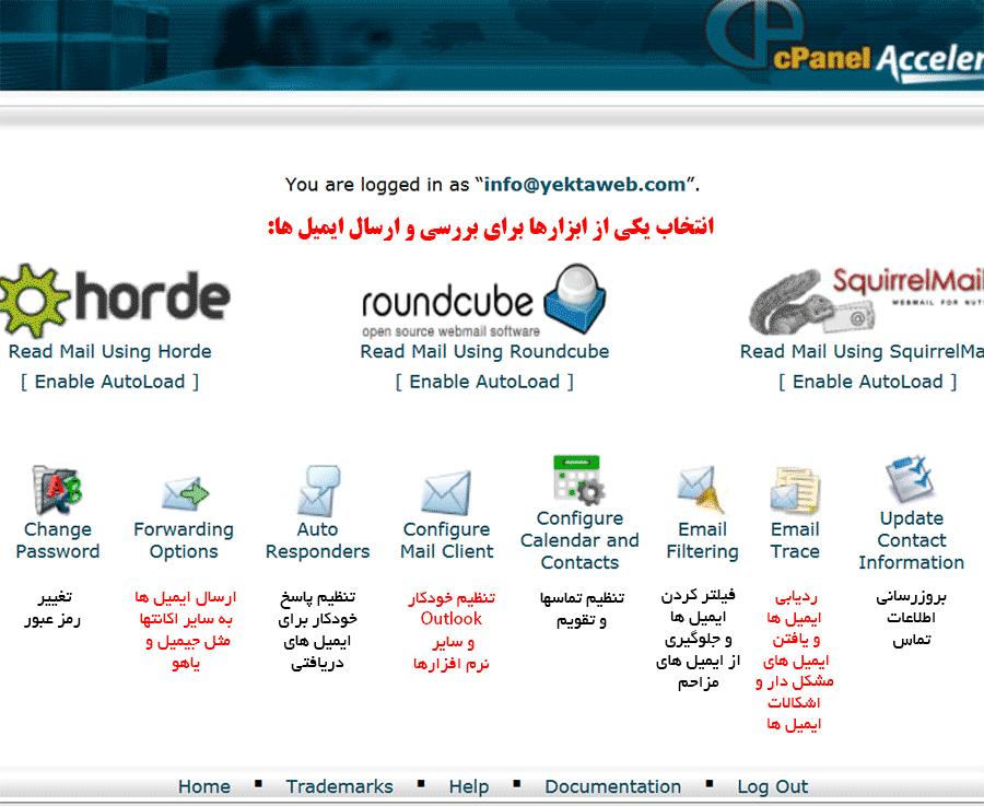 راهنمای سرویس Webmail برای استفاده از سرویس ایمیل از نشانی سایت خود به همراه webmail (پورت 2096) استفاده کنید. برای مثال: https://yektaweb.net/cpanel گاهی در شبکه دسترسی به این پورت وجود ندارد. در این حالت نشانی زیر را امتحان کنید: https://yektaweb.net:2082 گاهی در شبکه دسترسی به این پورت نیز وجود ندارد. در این حالت موضوع را با مسوول شبکه خود طرح نمایید.